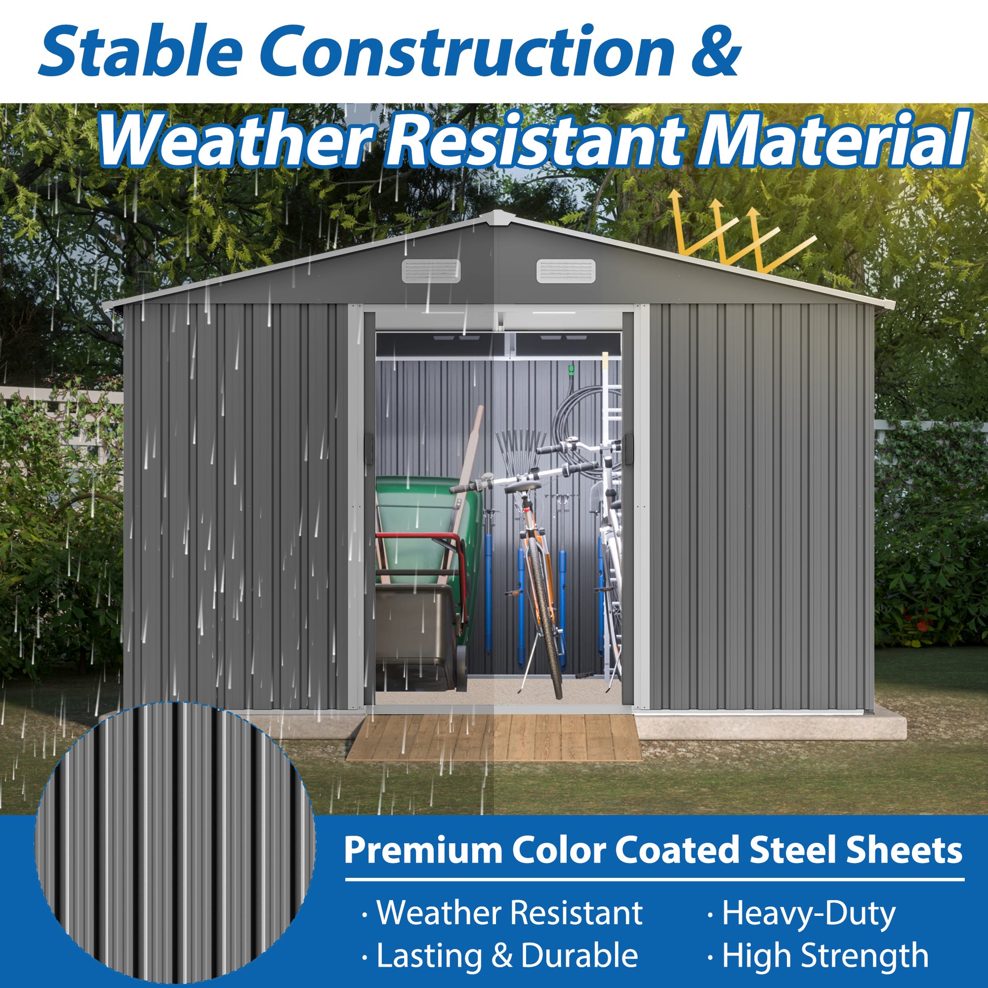 - 【All-Weather Use】This shed is built to endure any weather with its rust-resistant, UV-resistant galvanized steel construction. Its steep roof efficiently sheds rain and snow, while ventilation vents maintain airflow and prevent moisture buildup.